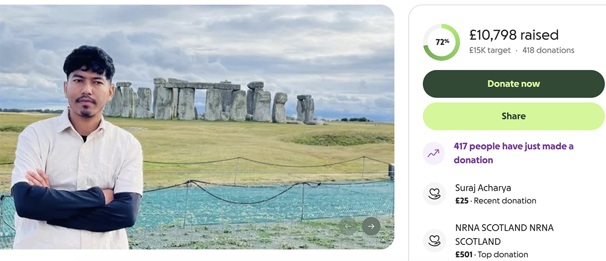 'गो फन्ड मि'बाट थालिएको सहयोग संकलनमा यो समाचार तयार पार्दासम्म १० हजार ७९८ पाउन्ड उठेको हो । उक्त रकम संघसंस्था र व्यक्ति गरी ४१८ जना दाताले दिएका हुन् । सहयोग समितिले १५ हजार पाउन्ड उठाउने लक्ष्य राखिएको छ । सबभन्दा बढी सहयोग एनआरएनए स्कटल्यान्डले ५०१ पाउन्ड दान दिएका छन् ।